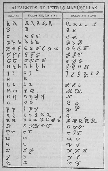U-V. No hay diferencia en el uso de estas letras en la Edad Media y en los primeros años de la Moderna. La U tuvo generalmente forma uncial en los siglos XII al XV, y la V, la forma capital, pero con su trazo izquierdo sobresaliendo del resto de la letra.