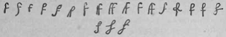 f. En el siglo XII, tiene forma muy parecida a la f moderna tipográfica. En el XIII, sin dejar esta forma, la modifica prolongando generalmente su trazo principal por bajo de la línea del renglon.