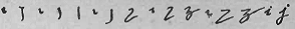 i-j. Hasta el XV se usaron indistintamente la i y la j; ambas de forma parecida a las nuestras de imprenta (i, j) pero sin puntos y sin el volteado de la j en su caída. En los siglos XVI y XVII, tiene la misma forma la i, prolongándose generalmente más su caída y admitiendo en esta formas angulosas. Las j son parecidas al guarismo 3 con su remate volteado y cruzando sus trazos principales.