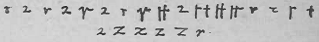 Z. Semejante a la que suele aparecer en los manuscritos romanos, aparece en los documentos de los siglos XII y posteriores con sus trazos encorvados. A veces termina por debajo de la caja del renglón por medio de una caída curva.