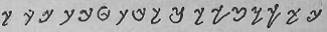 La primera se presenta generalmente constituida por dos trazos que forman ángulo agudo, sin trazo horizontal que los una (A), según era usual entre los romanos (I). A veces, sin embargo, tenía el travesaño central, ya formado por una sola línea recta, o por dos en ángulo obtuso, cuyo vértice se dirigía hacia la parte inferior.